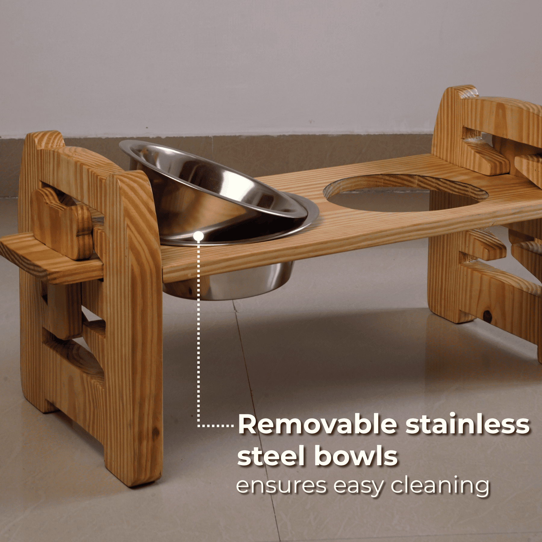 The RegalWood Series brings handcrafted pinewood elegance to your pet’s mealtime. With adjustable height, a lick-safe finish, dual stainless-steel bowls, and a sturdy 4.5 kg frame, it ensures better posture, easy digestion, and a stable, hygienic dining experience.